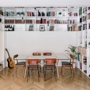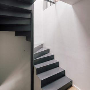 Как объединяющий элемент, полка поднимается, колонизируя как жилые, так и вестибюльные пространства. Таким образом, мы интегрируем эстетику и функциональность в один элемент. Первый участок лестницы представляет собой твердый, приподнятый объем в отличие от второго участка, который развивается в гофрированный металлический лист, который складывается, образуя ступени.