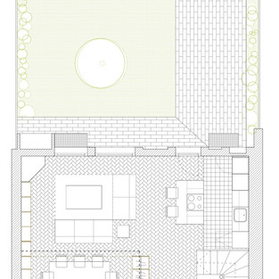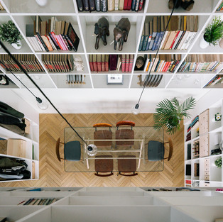 Основное вмешательство заключается в создании двойной высоты вокруг жилой площади дома; это организует вестибюль на верхнем этаже.