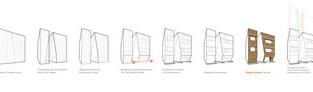 Еще одним требованием клиента была сделать проект искренним и простым с уникальным дизайном экстерьера. Соответственно, принимая во внимание пропорции высоты и ширины здания, мы разработали четырехугольник с трещиной, превратив здание в скульптуру, выходящую с улицы. Это решение не только очень хорошо раскрывает вход, но и удобно реагирует на пространственные деления верхних уровней.
