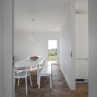Внутренний и внешний тротуар покрыт керамической плиткой ручной работы Санта-Катарина, а стены покрыты белой штукатуркой. Окна металлические с деревянными жалюзи.