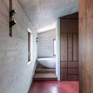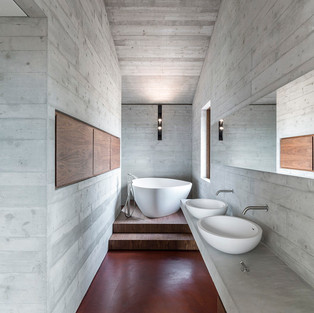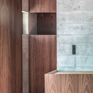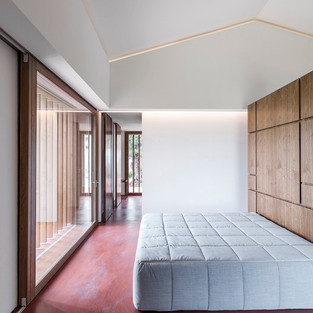 На втором этаже, окруженном большой лестничной площадкой с балюстрадой, находятся главная квартира и две спальни с двуспальными кроватями и ванными комнатами. Дизайн мебели, полностью изготовленной архитекторами GGA и выполненный из натурального дерева грецкого ореха, квалифицирует и создает порядок в каждой комнате, скрывая зоны обслуживания, заводские и технологические компоненты. Пристройка, с ее деревянной каркасной конструкцией, представляет собой отсылку к амбару. Третье здание расположено в саду на небольшом искусственном холме. В его подвале есть кладовая для садового инвентаря и барбекю на первом этаже. Эта часть сада, с ее неровной геометрией, сделанной из Кортеновых ступеней и травы, хочет немного оторваться от строгости всей наружной композиции.