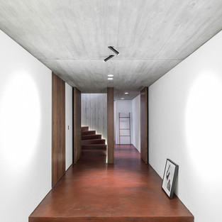 Броская железобетонная конструкция внутреннего периметра создает пространство для проникновения естественного света и освобождает пространство от любого другого несущего элемента. Планировка распределила помещения на трех уровнях. Чтобы избежать парковки автомобилей и видимости любого вида транспорта на уровне сада, гараж расположен в подвале. На нижнем уровне, помимо технических и производственных помещений, находятся все основные помещения: кинозал, выставочная галерея в соединительном пространстве между главным зданием и его пристройкой, а еще, тренажерный зал с прилегающим спа-салоном. Из подвала лестница ведет прямо в сердце главного здания, откуда открывается потрясающий вид на холмистый ландшафт и бассейн. Первый этаж, полностью проецируемый на улицу, не имеет никакого решения для непрерывности с садом: это гостиная, столовая, кухня и частное студийное пространство.