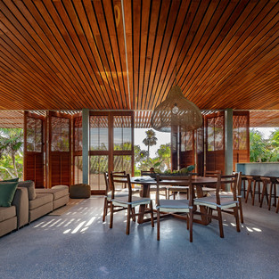 Промежуточный L-образный план дома начинается с первого этажа, простирается через большие террасы и перголы, созданные из местного дерева. Таким образом, внутренние пространства увеличены и защищены от солнца; и, тем самым, достигается хорошая перекрестная вентиляция (система кондиционирования воздуха есть только в спальнях). Эти террасы имеют складной механизм, который защищает дом в случае ураганов: поднимая и опуская эти тяжелые элементы к фасаду, открытая и прозрачная резиденция превращается в прочный закрытый ящик.