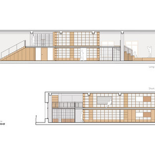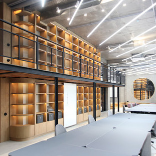 В центре зала находятся стеллажи высотой от пола до потолка, которые переплетают пространство. Они предназначены для демонстрации визуальной работы компании в лучшем свете и хранения их обширной библиотечной коллекции и канцелярских принадлежностей. Дерево приносит тепло в пространство и уравновешивает существующую бетонную структуру здания, которая осталась нетронутой. Различные виды отопления и режимы освещения были реализованы в соответствии с различными формами использования и настроениями пространства.