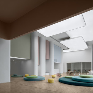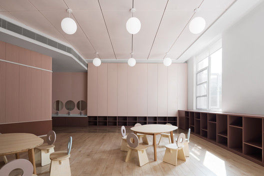 Детский сад – это пространство в 6 000 кв. Классные комнаты простираются от 2-го этажа до 4-го этажа, который зажат закрытыми игровыми площадками на первом и верхнем этажах. На первом этаже расположены зоны, предназначенные для взаимодействия родителей и детей, в том числе Родительский прием, Малый театр и Детский зал, а на верхнем этаже помещения предназначены для еды, игр и музыки.