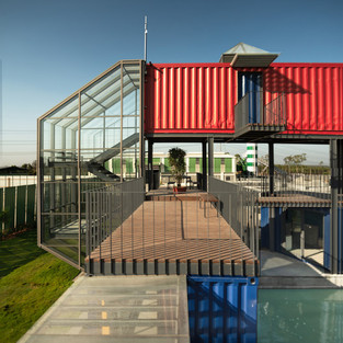 Нашей целью было создать удобный и экологичный дом. Ярко-красные, ярко-желтые и темно-кобальтово-синие контейнеры рисуют симпатичную картину на фоне солнечного неба, ландшафтного окружения и существующего однообразия металлических заводских структур зеленого цвета. Большое остекление консольной лестницы соединяет жесткую сложную форму с ландшафтом. Пейзаж дополняет индустриальный характер архитектуры, а также способствует активности, и, следовательно, добавляет вибрации на весь сайт.