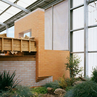Внутри полупрозрачной, усиленной стеклом полиэфирной обшивки сарая расцветает оазис. Умная облицовка с гелевым покрытием обеспечивает разные уровни УФ- и инфракрасного сопротивления, а панели с различной отделкой были развернуты для оптимизации солнечного проникновения и затенения в зависимости от ориентации каждой плоскости фасада и крыши. Тепловые характеристики стабилизируют температуру внутри круглый год, поэтому зимой есть тепло, а летом - охлаждающий эффект. Большие отверстия и высокая фенестрация обрамляют вид на окрестности и небо, а также контролируют вентиляцию. Сельскохозяйственные достижения были использованы для повышения урожайности сельскохозяйственных культур и эффективности строительства.