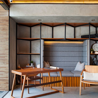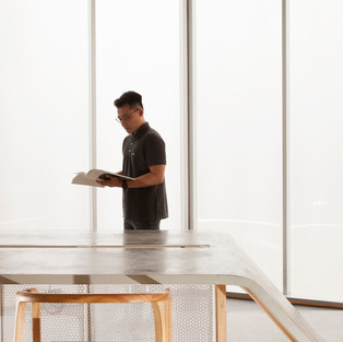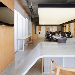 Danpalon (жесткий поликарбонат), материал, который мы использовали для облицовки фасада, хорошо соответствует этой цели, так как он ограничивает видимость снаружи, уменьшает визуальные отвлекающие факторы, и в то же время пропускает солнечный свет. Мы интегрировали простое формирование таблицы линейного типа со шкафами, окружающими столы, чтобы обеспечить более эффективное взаимодействие между рабочим пространством и местом для хранения.