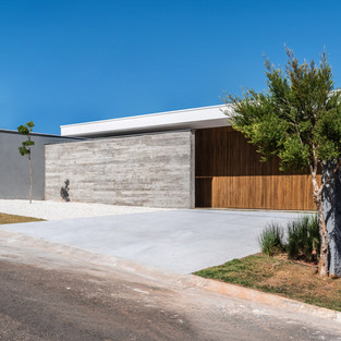 Фасад выполнен из массивных геометрических объемов, встроенных в различных планах дома, создающих новые оттенки, фигуры и углы освещения.