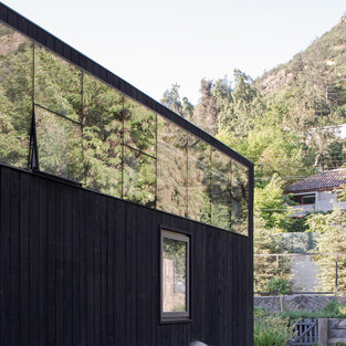 Пользуясь близостью участка с горами, внутренние пространства открываются на восток через проемы в верхней части каждой стены, соединяя внутренние помещения с близлежащими вершинами. В то время как внешняя деревянная облицовка переняла темные оттенки минеральных пигментов — в отличие от ландшафта, — материалы внутренних помещений склоняются к светлым тонам.