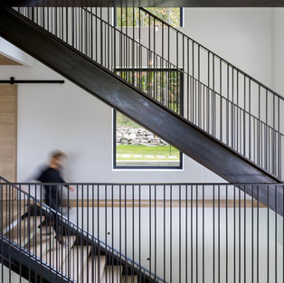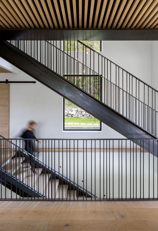 Принимая во внимание "случайные узоры" и движения в пейзаже, цветовая палитра фасада повсюду является текстурной и тональной, подчеркивая естественную красоту и неравномерные несовершенства дерева, плитки ручной работы, почерневшей стали, бетона и камня. Смещенная стальная лестница, соединяющая три этажа дома, является центральным элементом интерьера.