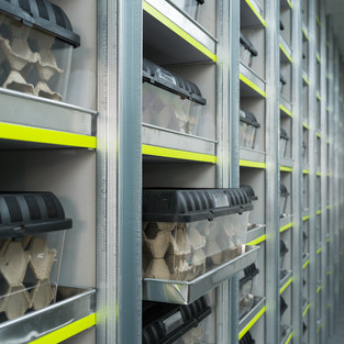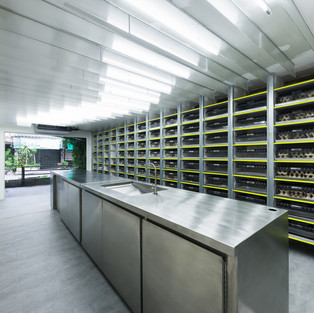 Стена с одной стороны представляет собой вертикальную стеллажную систему, содержащую ящики с разнообразными насекомыми, представляющими идею вертикального земледелия. Каждая колонна разделена простым местным строительным материалом, который представляет собой цинковый клиновый каркас, обычно используемый для возведения гипсовой перегородки. Неоновый цвет, в который окрашены края каждой полки, придает свежий и игривый вид всему торговому пространству.
