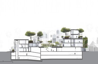 Окруженный этой группой белых «домов» с скатными крышами, внутренний двор 2-го этажа образует центральное ландшафтное пространство (сад) для сбора небольшого количества людей.