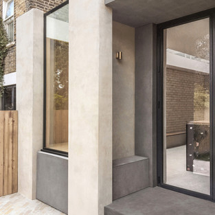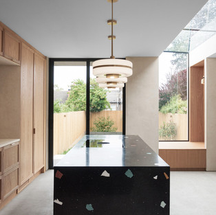 Капсульное окно также отражает в своей форме эти брутальные тенденции, но окрашенная дубовая древесина его рамы показывает более мягкий подход к дизайну. Элементы фасада, такие как бледный кирпич и серая полированная штукатурка, вводятся внутрь и сочетаются с теплыми дубовыми столярными изделиями, штукатуркой песочного цвета и латунью в преднамеренной попытке сделать интерьер более частным вариантом той же архитектуры. Черные объемы, такие как сделанный на заказ кухонный остров терраццо и обеденный блок, вместе с белым потолком по всему пространству предназначены для обеспечения необходимого контраста с палитрой естественной материальности и, следовательно, усиливают впечатление от необработанных поверхностей ручной работы. В результате получается яркое, просторное и уникальное дополнение к традиционному имуществу, которое соединяет пространство с его ландшафтом и прославляет мастерство его материальности.