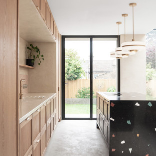 Решив вырастить свою семью, владельцы дома Глин лишились большой открытой планировки, где все могли бы быть вместе и наслаждаться видом на сад. Поэтому нашей студии было предложено переосмыслить заднюю часть их Викторианской собственности, где располагалась кухня, и создать большое пространство, которое подходит для различных повседневных занятий, сохраняя при этом связь с передней жилой зоной дома. Эта связь оказалась самой большой проблемой проекта, поскольку мы имели дело с семиступенчатым понижением уровней между гостиной и кухней, одновременно выясняя способы скрыть лабиринт водопроводных труб, окружавших существующий задний фасад. Конструктивное решение было выполнено в виде удлиненного капсульного окна со ступенчатым подоконником, очерчивающим его форму и скрывающим функциональные элементы здания в своей пустоте.