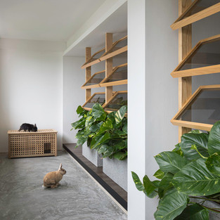 Зеленые растения около входа приносит жизнь в пространство, создавая защиту частной жизни. Деревянные жалюзи и большие растения в горшках, расставленные вдоль окон, становятся защитой от солнечного света. Также в квартире встроена мебель, сделанная по индивидуальному заказу, в которой плавно интегрированы компоненты для отдыха, питания и работы.