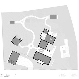 В другом крыле дома находятся: главный гараж, дом для гостей из утрамбованной земли, небольшая сводчатая комната для медитации на юге, почти невидимая между деревьями, и художественная студия для владельца дома.