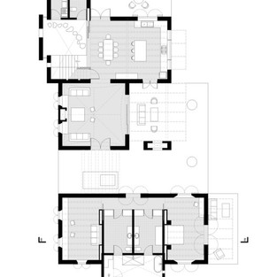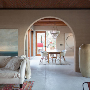 На восточной стороне три разных утолщенных земных пространства взаимодействуют друг с другом, создавая общие открытые пространства. Дорожка ведет посетителя к удивительному виду Мар Кортес и распределяет зоны. С левой стороны два физически связанных тома получают основные общие области. Гостиная, покрытая черепичной сводчатой крышей, открывает пространство для гостиной и кухни через большую утрамбованную арку. На широкой кухне открывается панорамный вид на восточную сторону и небольшим внутренним двориком, который привносит в дом природу на открытом воздухе.
