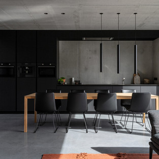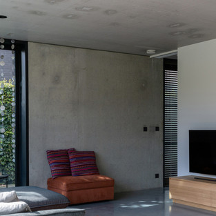 Проект HOEV, имеющий бетонную конструкцию, удивительно открыт и тепел. Дом был спроектирован с учетом будущего семьи, так как главная спальня и ванная комната расположены на первом этаже.