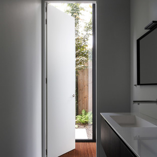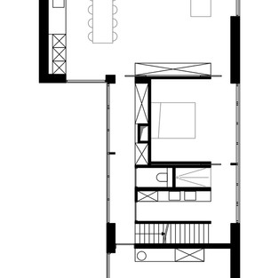 Контакт с улицей был деликатно создан узкими, элегантными окнами, так что интересное взаимодействие может быть создано без ущерба для интимности дома. Кроме того, открытая планировка создает много контактов между различными зонами внутри дома. Мебель прекрасно вписывается в архитектуру, в то время как пустота делает пространство увлекательным и текучим.