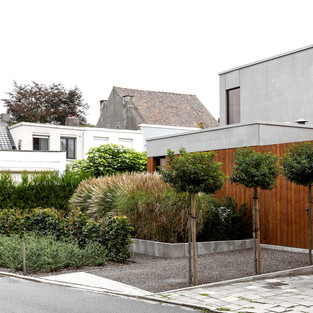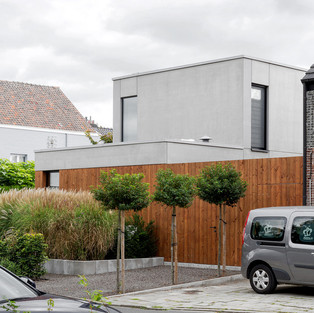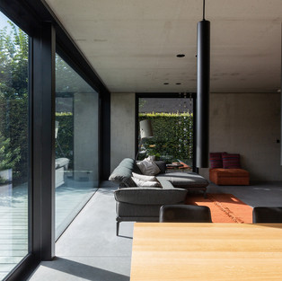Основные функции размещены в задней части дома; более того, объем расположен таким образом, чтобы доступ к солнцу был максимальным и не мешал соседнему входу. Для фасадных материалов были выбраны бетон и дерево в современной и вневременной интерпретации. Низкоэнергетический дом в бетонной конструкции был выбран как долговечное решение. Он имеет высокую теплоизоляцию, а конструкция полностью герметична.