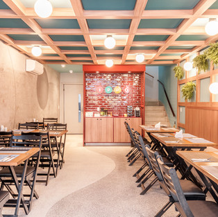 Изюминкой проекта является большая деревянная решетка, установленная в каждой комнате. Помимо красоты, она была построена по двум важным причинам: отсутствие нескольких точек освещения и акустические проблемы. Потолочная плита, рассчитанная на одну точку освещения, и решетка, поддерживающая создание новых источников света, вместе обеспечивают освещение, необходимое для ресторана. В центре каждой сетки находится акустическая панель, окрашенная в основные цвета ресторана, которая поглощает чрезмерный шум, особенно в часы пик, и создает комфортную акустическую атмосферу для клиентов.