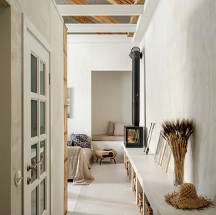 Когда кирпичный потолок, лежавший на прогнивших досках, рухнул, под ним обнаружились вековые деревянные балки, и металлические двутавры (мы спрятали подсветку за ними), и антресольное окно, все эти элементы многое продиктовали в проекте. Конечно, все эти детали доставили массу хлопот, но оно того стоило. Это позволило создать антресольную кладовую над спальней, а еще и антресоль над ванной комнатой, доступ к ней осуществляется через библиотечную лестницу.
