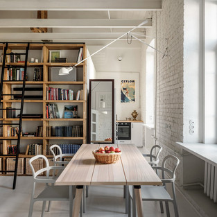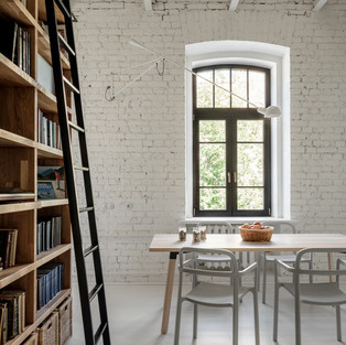 Над библиотекой удалось сделать светлое окно в ванную комнату, я думаю, что это хороший элемент в проекте. Благодаря крыше и высоте потолков в квартире, окно мезонина заливает все пространство солнечным светом.