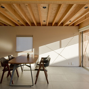 Кроме того, угловые деревянные жалюзи размещены для дальнейшего контроля прямой видимости изнутри и снаружи, тем самым обеспечивая открытую, но частную, жилую среду. Форма здания помогает блокировать резкий солнечный свет лета и впускать мягкий солнечный свет зимы. Эффект яркого летнего света может быть дополнительно отрегулирован при помощи японской бумажной завесы.