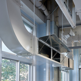 Раньше биолаборатория была кухонной секцией студенческой столовой. Присутствие воздуховодов, "ползущих" по потолку, ошеломляло. Как только помещение утратило свою первоначальную функцию кухни, сложные формы воздуховодов и вытяжек стали похожи на скульптуры. У нас нет бюджета, чтобы удалить их все. Затем я подумал, что, возможно, было бы интересно повторно использовать воздуховоды и вытяжки, чтобы сохранить память о пространстве, которое заполняло желудок студентов в течение последних 50 лет.
