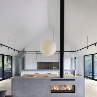 Гостиная, столовая, и кухня являются основными функционирующими комнатами в доме. Внешняя облицовка дома темного цвета, выполнена в сайдинге Shou Sugi Ban, который устойчив к гниению и насекомым, а внутренняя отделка светлая и воздушная.