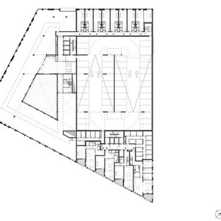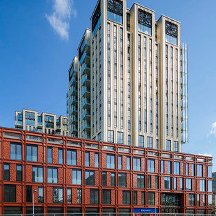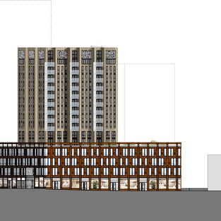 В темно-красном четырехслойном цокольном здании размещаются студии и коммерческие помещения на привокзальной площади, такие как коммерческая штаб-квартира Heineken и пивоварня, которые будут открыты в конце этого года. Чтобы подчеркнуть разницу в использовании и ориентации, здание цоколя состоит из двух различных выражений фасада: бетонный каркас на привокзальной площади и кирпичная кладка и оконные рамы из белого бетона вдоль жилой улицы.