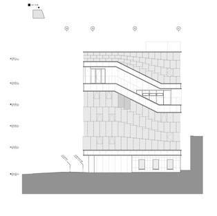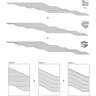 Постепенно трансформирующийся и сдвигающийся фасадный модуль тщательно согласовывается в трехмерном пространстве, от улицы к интерьеру здания, а изогнутый фасад создает плавный и плавный переход с уровня улицы к крыше здания. Все это соединяется с другим уровнем улицы внутри здания через путь, который освещает свет и гармонизирует звуки с улицы.