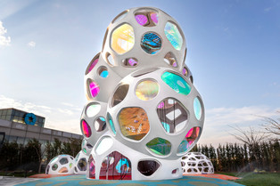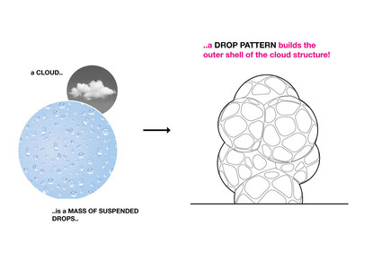 У детей должна быть возможность находиться в тени, если погода теплая и солнечная, и играть под навесом, когда идет дождь. В коммерческих зонах и на террасах зачастую доступно только ограниченное пространство. Из-за этого возникают трудности для большого количества детей, посещающих игровые площадки такого типа, особенно в час пик. По этой причине одной из отправных точек стали мысли о высоких структурных объектах с большими объемами, полностью играбельными изнутри. Детская площадка состоит из четырех зон, которые отвечают запросам разных групп посетителей. Она предназначена для самых маленьких и самых высоких, отведены отдельные места для малышей, выстроен скалолазный купол и скалолазная башня, высотой почти восемь метров с внутренней горкой, а также большой ансамбль "облачных" сфер .