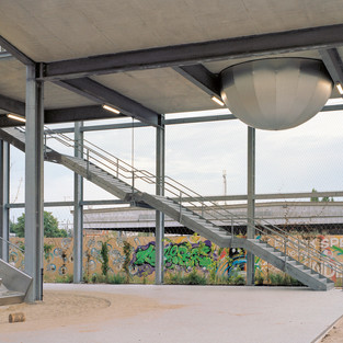 Кроме того, для этого требуется множество внешних детских площадок. Для того, чтобы противостоять нехватке пространства, справиться со сложностью программ изнутри и проложить общественный путь, максимальная оболочка здания разделена на две половины: одна компактное здание, в котором размещены все внутренние функции, и внешнее пространство. Между ними, а также под детской площадкой первого уровня, выполненной из стеклянной плитки, дорожка пересекает объем.