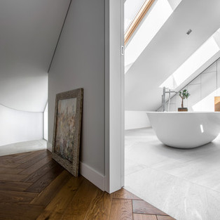 Первый этаж состоит из основного пространства для семьи: кухни, спальни, домашнего офиса, небольшой ванной комнаты и подсобного помещения. В то время как второй этаж посвящен исключительно хозяевам дома с просторной ванной комнатой, спальней и террасой, с которой открывается великолепный вид на панораму Вильнюса. В самом начале главная спальня должна была находиться на первом этаже, но в процессе проектирования дизайна второго этажа, клиенты решили создать свой собственный оазис именно там. Светлые, уютные помещения созданы уникально и качественно для повседневной рутины, в то время как первый этаж стал больше ориентирован для гостей, рабочее пространство и хозяйственные нужды.