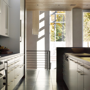 Продление крыши и легкие выступы создают четкое определение между вертикальными пространствами. Упорядоченная ось ломается снаружи дома, так как асимметричная консольная крыша направляет ваш взгляд на лес и озеро на западе.