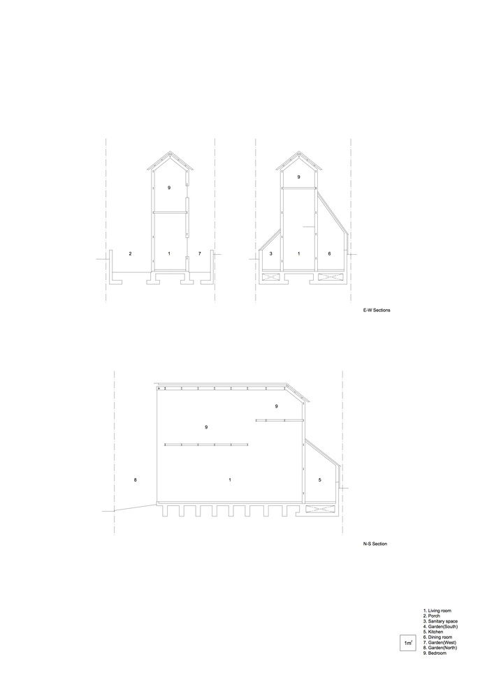Центр всей деятельности, если уж на то пошло, основан на этих пристройках. Эти пространства созданы путем простого перекладывания стропил между подпорными стенами примыкающего дома и главным домом, а различные элементы, такие как кухня, обеденный стол, мебель и ванна размещены в основном доме, как бы окружая его. Это пространство чем-то напоминает проходной сад, совмещая экстерьер и пристройку вместе с границей участка.