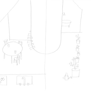 Внутренняя часть представляет собой изогнутое пространство, в котором часть лестницы, тонкий стальной каркасный пол и одинаково выровненная фурнитура "разбросаны" вокруг без ощущения расстояния друг от друга. Связь между этими элементами становится заметна только после того, как жильцы поживут вместе с мебелью, определив всему свое место. Фронтон дома раскрывает обстановку кукольного домика, открытого и видимого с соседней улицы.