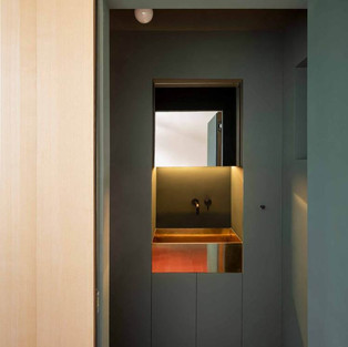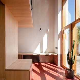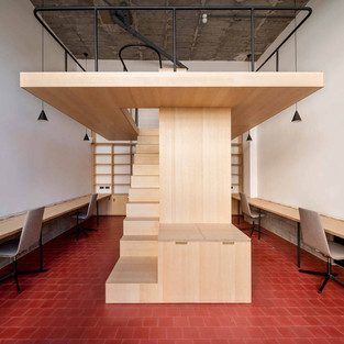Деревянная решетчатая структура фасада спроектирована таким образом, чтобы обеспечить увеличенный открытый вид на верхнем уровне, одновременно сужая сетку, чтобы гарантировать достаточную конфиденциальность на уровне улицы. Внутренняя отделка сокращена: цементная плитка ручной работы кроваво-красного цвета, ясень для центрального объема, столы и книжная полка во всю высоту с латунными деталями. Интерьеры центрального объема выдержаны в темно-зеленом цвете, контрастирующем с красным полом и латунными деталями. Базовый курс повторяет первоначальные и поддерживаемые бетонные блоки потолка. На мезонине постелен серый ковер, придающий помещению более уединенную и непринужденную атмосферу. Проект и, следовательно, выбор материала предназначены для создания баланса яркой, залитой светом, минималистской студии, подходящей для сосредоточенной работы, предлагая при этом спокойную, теплую атмосферу.