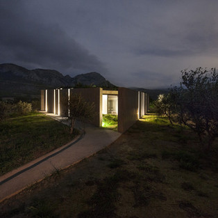 Строгая форма, кажется, разорвана двумя пустыми атриумами, которые противопоставляют себя друг другу. Создание северного двора потребовало более высокой степени сложности: две колоны треугольного сечения, находящиеся под разными направлениями, металлические композиции составляют часть структуры проекта. Архитекторы хотели создать связь между домом и горами Герания. Коричневый, цвет оголенной бетонной оболочки связывает дом с его теплым, землистым полем. Вертикальные разрезы впускают солнечный свет внутрь.