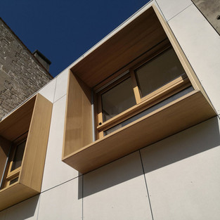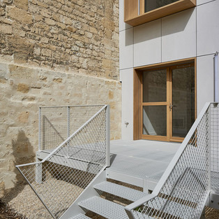 Каменный фасад здания выходит на общественную улицу. Он защищен и претерпел лишь очень незначительные изменения: - замена деревянных столярных изделий, моделирование которых осталось в соответствии с существующим, и обработка грубых железных перил, - очистка каменного фасада и сбор разрушенных и разрушенных частей. Особое внимание было уделено соблюдению оригинальной эстетики здания.