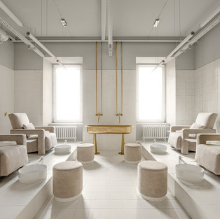 Зона Педикюра. Педикюрная зона расположена на подиумах, эргономичный дизайн которых идеально подходит для мастеров маникюра. Подиумы оборудованы встроенными выдвижными ящиками и умывальниками для использования персоналом салона; во время вечеринок они покрыты полыми журнальными столиками. В середине зоны находится отдельно стоящий умывальник, собранный из двух детских ванночек советской эпохи. В целом педикюрная зона выполнена в светлых тонах с контрастными золотистыми акцентами, что придает ей ощущение чистоты без стерильного вида операционной. Дизайнерам удалось добиться эффекта "Берлина 60-х".