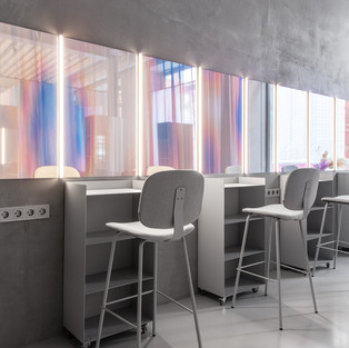Помещение имело хорошее обустройство с самого начала: высокий потолок и большие окна. Поэтому хотелось сохранить эту легкость и сделать пространство ярким и светлым. Все помещения окрашены в светло-серый цвет, включая мебель, и единственным ярким акцентом являются шторы, которые визуально и функционально являются ключевым элементом интерьера. Принт был создан совместно с Катей Пятицкой, основательницей студии Laroque, и вдохновлен тепловыми картами. Цвет был взят из логотипа проекта.