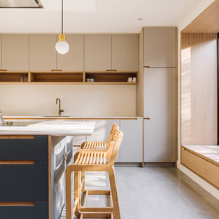 Тщательная координация ограниченного пространства позволила включить центральную кухонную столешницу, при этом оставляя место для обеденного стола. Кухонные гарнитуры были изготовлены из ламинированной фанеры с элементами дубового шпона, которые соответствуют древесине в других местах. Надежный полированный бетонный пол был выбран для обеспечения контраста с натуральным дубом и создания эстетики, которая одновременно была бы современной, практичной и гостеприимной.