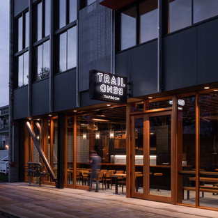 На уровне улицы здание отведено от линии собственности на несколько футов, чтобы обеспечить пространство для ужина на свежем воздухе; обширное остекление, состоящее из деревянных / стеклянных окон и фиксированных элементов, показывает движение улицы. На верхнем этаже здания находится открытая терраса для студии и квартиры. Застекленная стена из второго этажа с эркером в стальной оболочке простирается над тротуаром.