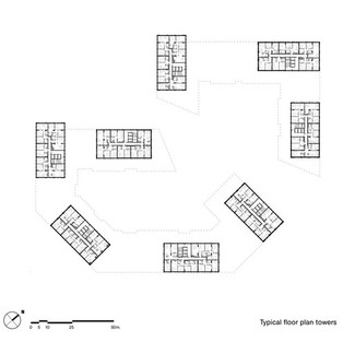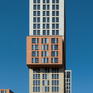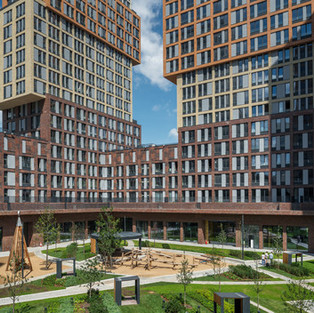 Вандер Парк сооружен вокруг центрального двора с садом, образованного за счет относительно небольшой нижней части дома. Над данным основанием возвышаются восемь жилых башен. Эти башни, высотой от 18 до 26 этажей, спроектированы как последовательности сложенных друг на друга фигур, обернутых в кирпичную кладку разных цветов - игривая композиция, придающая особую индивидуальность жк Вандер Парк на Московском горизонте. Чтобы удовлетворить минимальные требования к дневному свету, некоторые башни поворачиваются на 45 градусов, располагаясь таким образом, что они гарантируют прекрасный вид из каждой квартиры. Кроме того, повороты артикулируют наиболее заметные углы блока и создают постоянно чередующиеся перспективы башен в их городской обстановке.