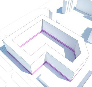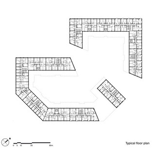 Нижняя часть дома, окружающая дворик, состоит из шестиметрового цокольного этажа, пяти этажей с квартирами и мезонетов над ним. На уровне первого этажа вдоль улицы расположены коммерческие помещения, а во внутренний двор выходят многочисленные помещения для удобства жильцов, такие как спортивная площадка и детский сад. Все дома на уровне первого этажа имеют открытое пространство, непосредственно примыкающее к набережной. Контрастируя с башнями, цоколь облицован темным кирпичом более тактильного характера, подчеркивая человеческий масштаб улицы, а также внутреннего двора. Общий двор, спроектированный компанией West 8, озеленен множеством деревьев и имеет круглую беседку в качестве центральной точки, обеспечивая укрытие во влажных или ветреных условиях, а так же в жаркие и солнечные дни.