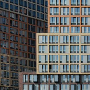 Кирпич является основным фасадным материалом в Вандер Парк, образуя основной каркас для бесчисленных окон и алюминиевых панелей. В современной России кирпичная кладка ассоциируется с качеством, потому что она контрастирует с серым бетоном и штукатуркой, которые раньше доминировали при постройке жилых зданий. Мы разработали пять стандартных фасадных конструкций, которые, благодаря сочетанию кирпичных сортировок и цветов, предлагают большое разнообразие без ущерба для единства городского ансамбля. Среди пяти стандартных фасадов два варианта были сделаны специально для цоколя. Один с эркерами, которые обеспечивают хорошую визуальную связь между частным и общественным, и один с более тектоническим внешним видом. Этот фасад имеет больше деталей, таких как вертикальная кирпичная кладка и выступающие камни, создавая более тактильный опыт на пешеходном уровне.