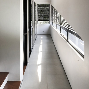 Основная часть обращена на восток, блокируя яркое западное солнце и позволяя пользоваться кондиционерами по-минимуму. Дом заполнен поперечной вентиляцией с каждой стороны дома и дополнительно имеет веранду, создающую связь с задним двором как с первого, так и с верхнего этажей. Гараж спроектирован как единое целое с главным зданием без дополнительных нагромаждений. Темные древесные породы напоминает атмосферу тропической виллы на Бали и создают успокаивающую атмосферу роскоши в скромном исполнении.